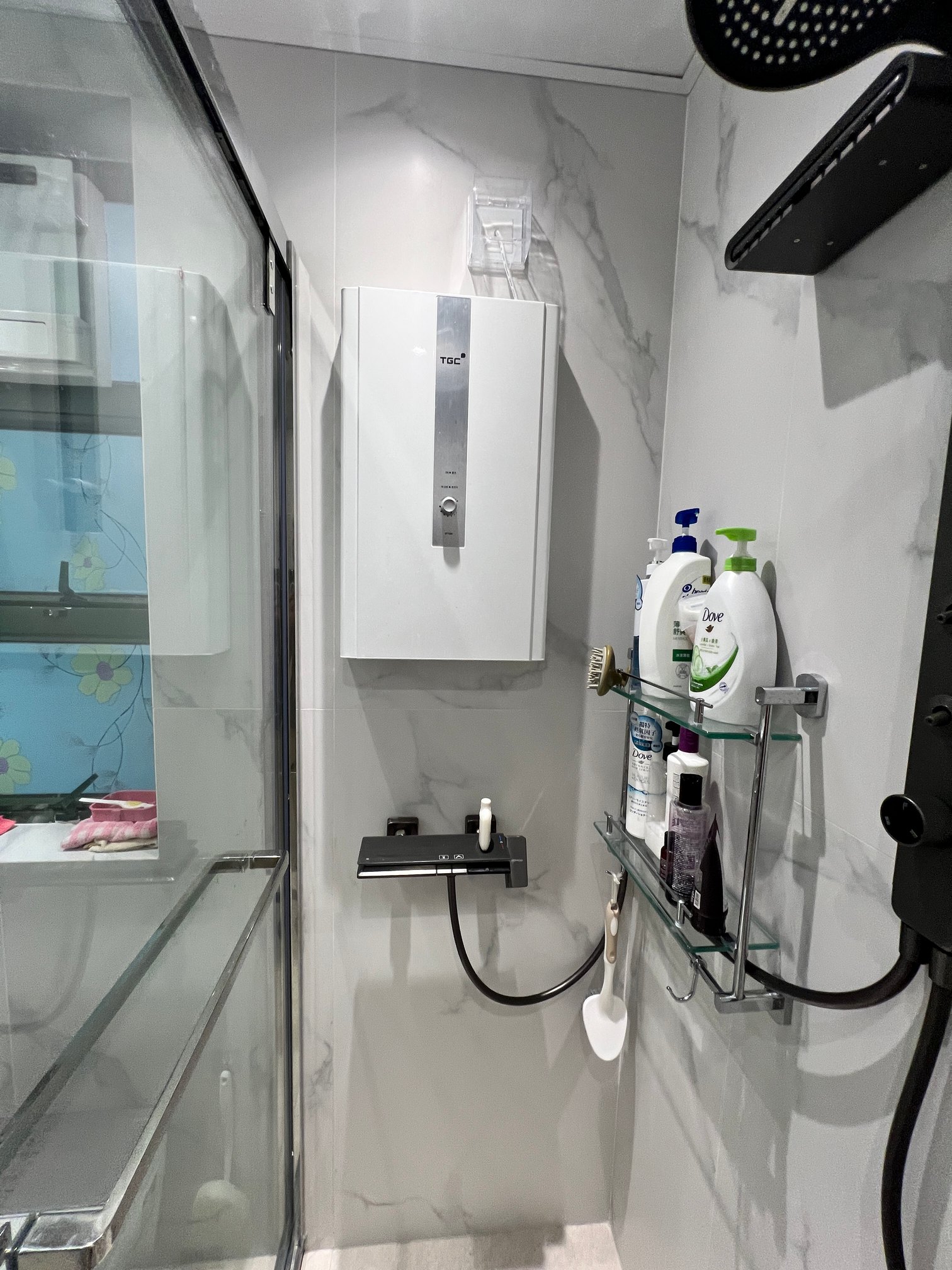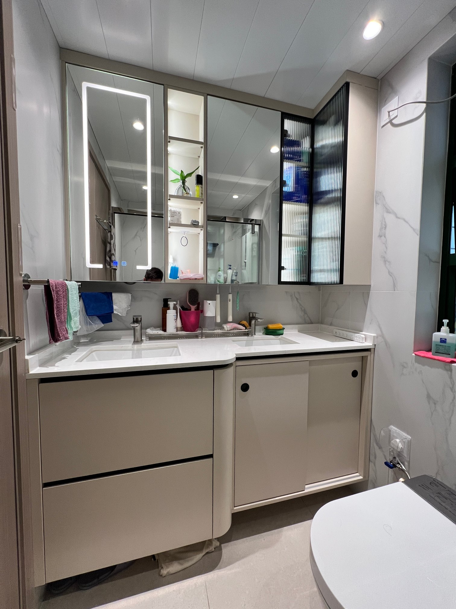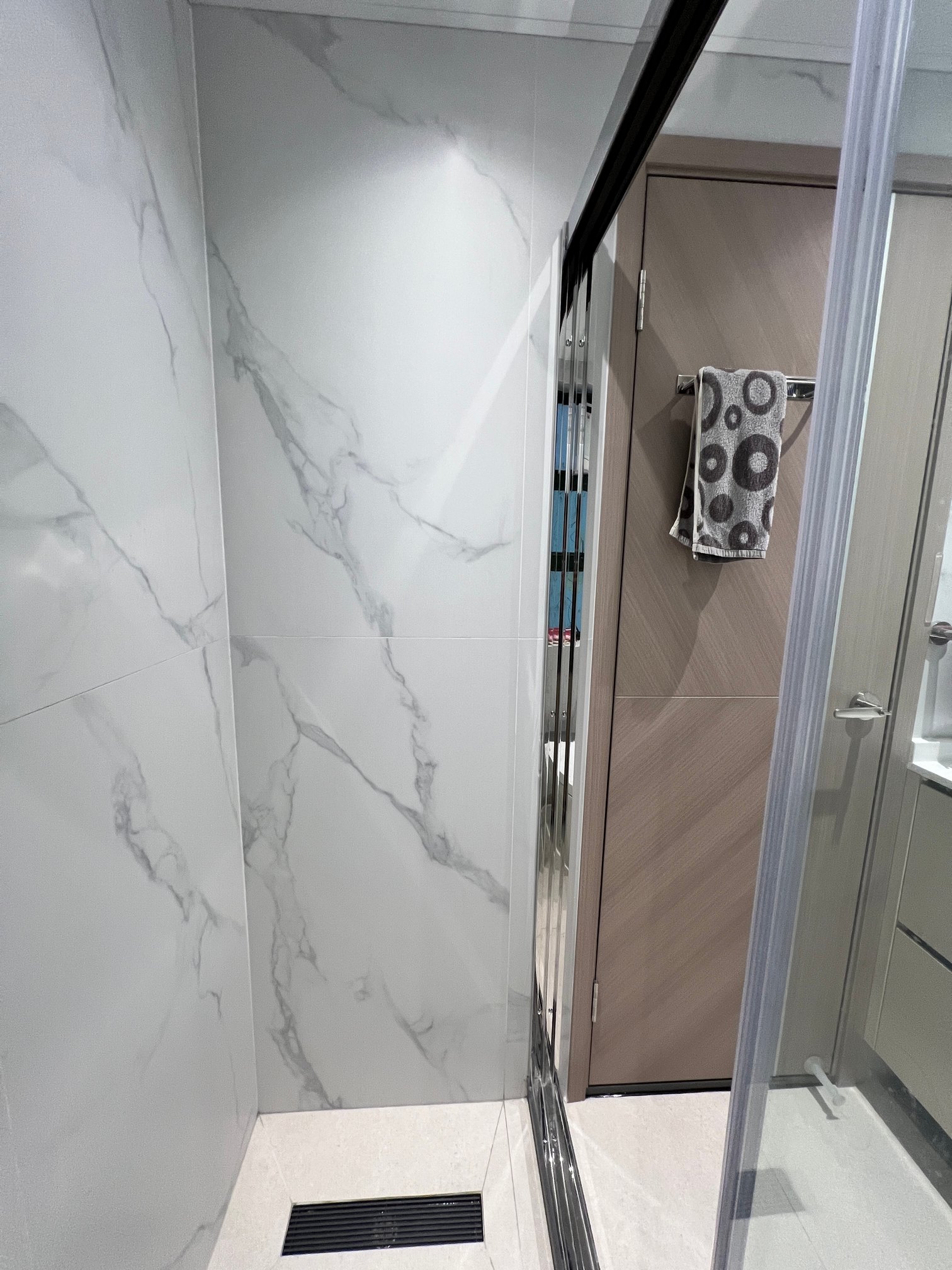 東港城廁所翻新 想將您的洗手間升級成現代豪華空間? 即刻睇吓我哋最新嘅洗手間裝修案例!呢個設計以優雅嘅白色大理石紋瓷磚為主調,營造出整潔廣闊嘅視覺效果。雙洗手盆配搭淨白大理石枱面同灰色儲物櫃,實用性同美感兼得;LED背光鏡唔單止照亮空間,更添美感,內置儲物格完美收納日常用品。