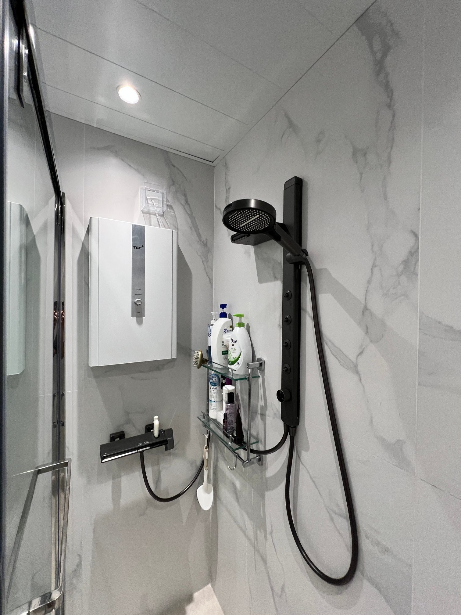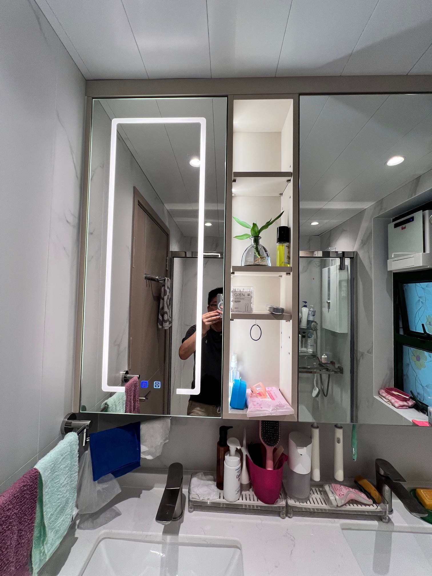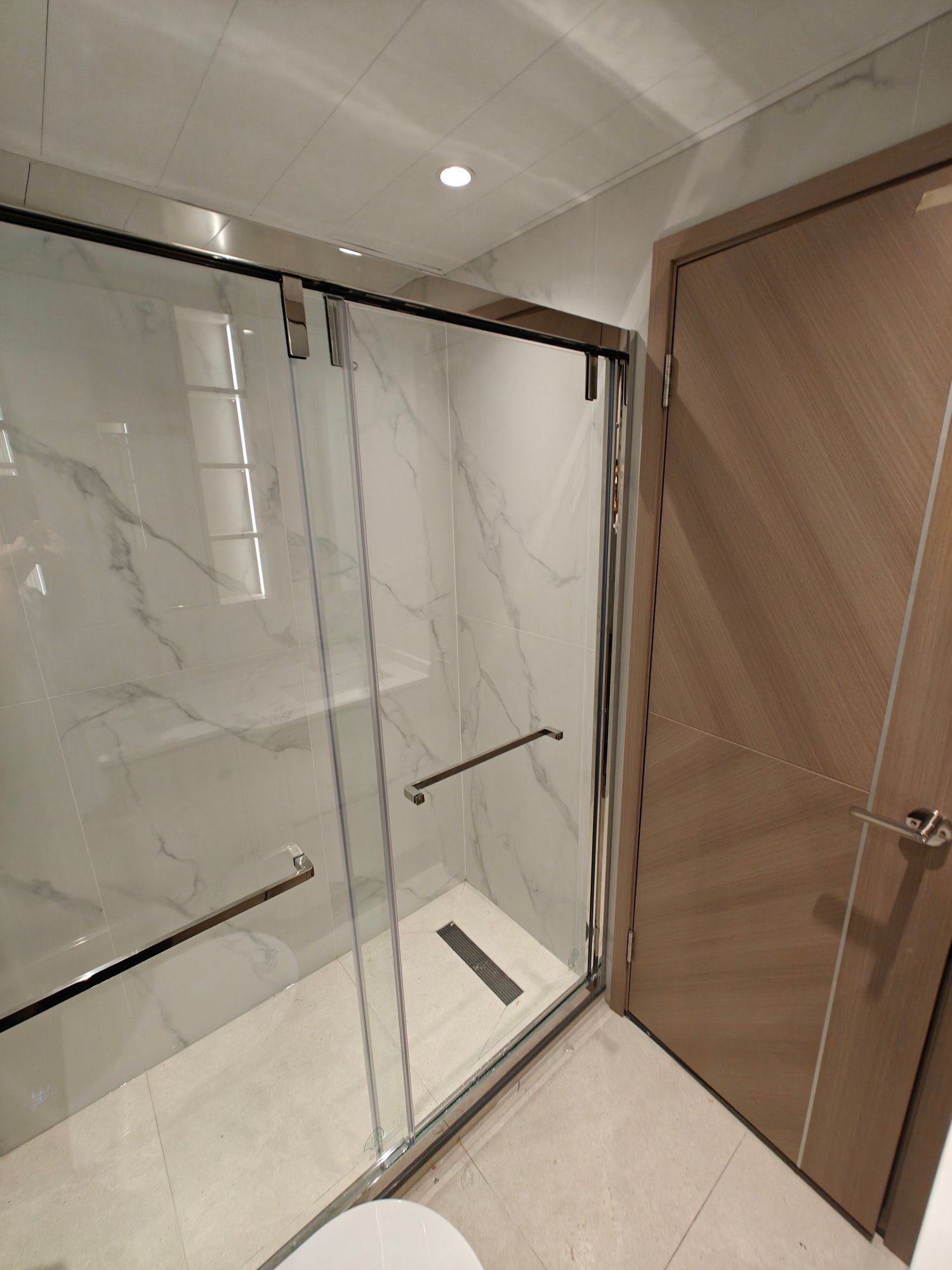 東港城廁所翻新 想將您的洗手間升級成現代豪華空間? 即刻睇吓我哋最新嘅洗手間裝修案例!呢個設計以優雅嘅白色大理石紋瓷磚為主調,營造出整潔廣闊嘅視覺效果。雙洗手盆配搭淨白大理石枱面同灰色儲物櫃,實用性同美感兼得;LED背光鏡唔單止照亮空間,更添美感,內置儲物格完美收納日常用品。